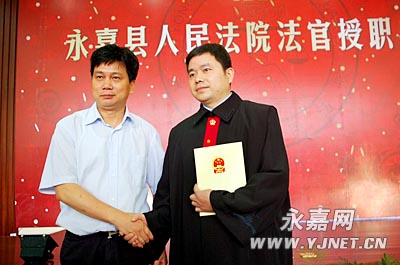 为加强法院法官队伍廉政建设,促进法官的道德教化和操守养成,11日上午,县法院首次举行法官授职典礼,县委书记任玉明寄语全体法官要爱惜法官荣誉,守护公平与正义,提升人民法官的职业尊荣感和使命感。市中级人民法院院长崔盛钢,县人大常委会主任汪大清、县政协主席谢崇福和县法院院长陈卫国参加仪式。