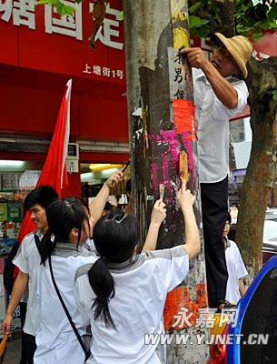 原标题:志愿者上街铲除招生“牛皮癣”