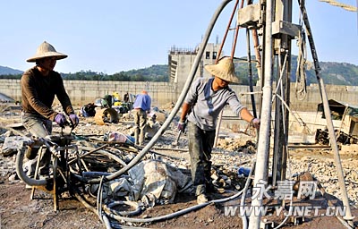 10月4日,记者在楠溪江供水工程施工现场看到,这里机器轰响,工人们在搬运沙石、焊接钢筋、浇筑水泥、固结灌浆孔、打垫层……一派繁忙景象。据了解,7月15日-10月15日是主汛期,按规定应停止施工,该工程施工单位为了确保按期完工,在台汛期间,一方面积极做好防台抗洪准备,另一方面利用台风间隙抢工期,为在非汛期建设的主体工程建设做好准备。记者 陈胜豪