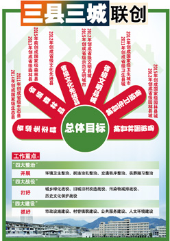 【目标】: 从今年开始,通过五年的努力,基本实现“三县三城联创”目标。力争2011年创成省级生态县,2014年创成国家级生态县;2013年创成省级森林县,2015年前创成国家级森林县;2012年创成省级文化先进县;2012年创成省级文明县城,2015年创成省级示范文明城市;2011年创成省级卫生县城,2014年创成国家级卫生城市;2012年创成省级园林县城,2015年创成国家级园林县城。