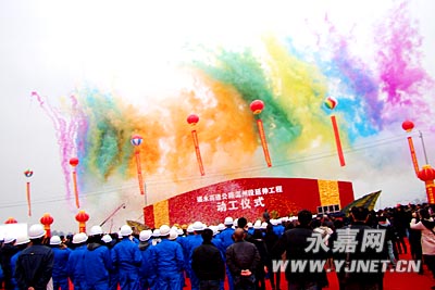 9点38分,副省长、市委书记陈德荣启动电动按钮,发布动工令,霎时喜炮雷鸣,礼花四射,彩带飘飞,金狮起舞,立于瓯江岸边的打桩机重重地打下第一桩。