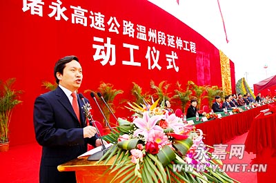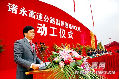 县委书记任玉明代表县四套班子领导对工程的顺利动工表示热烈的祝贺!对参加动工典礼的领导、来宾表示热烈的欢迎和衷心的感谢!任玉明说,这是永嘉交通建设事业中的一件大事,也是永嘉乃至全市人民期盼已久一件喜事。诸永高速公路温州段延伸工程是连接瓯江南北、进一步紧密永嘉与市区联系的重要纽带。它的建成将构筑永嘉和温州城区的快速交通通道,有利于永嘉更好地融入温州大都市,促进永嘉的大建设和大发展。任玉明表示,我们要在市委、市政府的正确领导下,进一步统一思想,真正把诸永高速公路温州延伸工程作为全县的头等大事抓紧抓好。我们将全力以赴做好征地拆迁、安置补偿等相关政策处理工作,认真处理好工程建设与群众利益、社会稳定的关系,确保工程顺利推进。我们将全力以赴做好协调服务工作,积极主动帮助解决工程建设中存在的困难和问题,确保工程快速推进,确保工程优质高效。