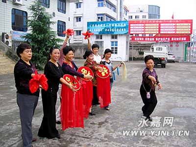 在这期间,作为中老年人自发性组织的协会,我们经常遇到没有经费也没有固定的排练场地的困境。但是幸得到了大自然房开、物业管理处、老年大学等单位的帮助和支持,借用了他们的地下车库和没出租的店面开展排练。同时,市、县政府都对我们的演出给予了很大的肯定和支持,出资让我们去培训。为表演出永嘉山水美景原汁原味且深具感染力的舞蹈,我们将从温州、杭州、上海等地学来的海派秧歌、盘花扇等现代舞蹈技术加以创新融入节目中。我们还时常自己琢磨着修改服饰、化妆,与几个队友一块到市场里看布料,为演出服设计新花样。