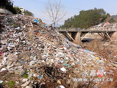 在岩头镇旅游路(路名暂定)旁的支流(五尺、表山支流下游)里,约100多米的岸边,倒着一些花花绿绿的塑料袋及其他生活垃圾。沿路而上,在鲤溪乡鲤溪村旁数百平方米的江边,也倒着些破衣服、背心袋等生活垃圾,有的浸泡在积水里,从淤泥里不断发出气泡,场面之大,令人触目惊心。继续沿着楠溪江沿线而上,在福佑村入口处支流里也倾倒着大堆生活垃圾,一些背心袋顺着溪水,慢悠悠地往下游漂去。在小源方向的珠岸村和碧莲镇下村碧东路旁的溪流里,也倒着大量的生活垃圾……其实,像这样大规模、煞风景的垃圾山或天女散花状遍布的现象,在楠溪江沿岸是随处可见。
