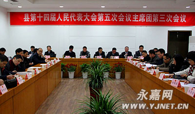 25日晚上,县十四届人大五次会议主席团举行第三次会议,张加波、汪大清、谢崇福、娄绍光、潘浪国、吕庆行、胡明杰、王国强、潘统龙等在主席台就座。大会主席团常务主席王国强主持会议。