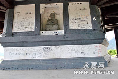 第一层塔身不仅白色墙体上写满了字,柱子、石阶和地面上也没能幸免被涂污,就连镶嵌在塔身的石佛像也被涂污得面目全非。低处已没有可写的空白位置,有人还爬上塔身,在2米多高的墙面涂写。幸好,该塔进入第二层的门已经被锁上,要不也会遭到涂污。