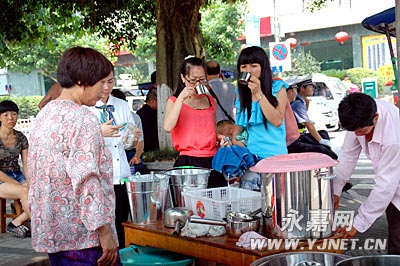炎炎夏日,喝口伏茶消暑降温。5日,农行永嘉县支行前的免费伏茶摊又开张了,深受路人欢迎。据该摊点的发起人——上塘前村的胡大妈介绍,在这些伏茶里,她加入了荷叶、夏枯草等10多种中草药,主要起到清凉消暑的作用。她自去年6月份开始烧伏茶后,陆续有邻居加入了这一行列,每天都要烧几十桶开水,据悉去年的中草药就花了6000多元。记者 汪学斌