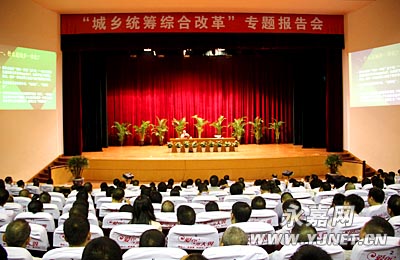 18日上午,我县举行“城乡统筹综合改革”专题报告会,邀请江苏省苏州市委农办卢水生作主题为“加强城乡统筹,促进城乡一体化”的专题讲座。县委常委、宣传部长郑秋文主持报告会。汪大清、谢崇福、郑秋文、金丐旦等县四套班子领导及县委理论学习中心组成员,各功能区、镇、街道乡科级领导等听取了报告会。