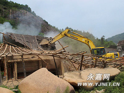 记者在该镇石埠村看到,一个约300平方米的违章砖瓦窑,外面用简单的毛竹、油毛毡等搭建而成,外面还有私拉的电线,窑里仍旧在加工砖瓦,存在严重的安全隐患。执法人员先将有关人员强制撤离后切断电源,挖掘机“铁臂”一挥,该违章砖瓦窑轰然倒塌。据悉,该砖瓦窑建于2004年,土地审批已过期(目前砖瓦窑已停止土地审批),属非法占地。随后,执法人员还对阳岙村草坪山1000平方米的违章砖瓦窑进行了强制拆除。