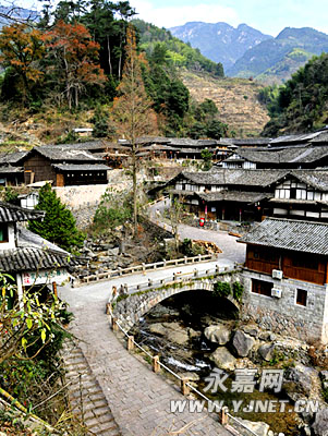 整个村庄被群山环绕,只有一条路通往公路,另有一条湍急的小溪,从村子里穿过,一座廊桥架在山谷之间,往里看是古老宁静的村子,往外看是通往繁华喧嚣的出路。站在桥上,犹如跨在时空的界限上。日前,记者来到岩坦镇林坑村,感受这世外桃源般的美景。