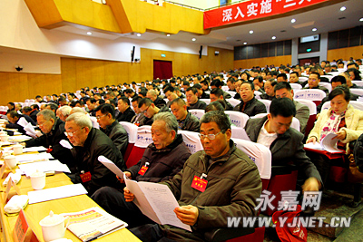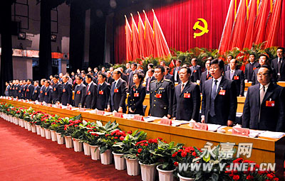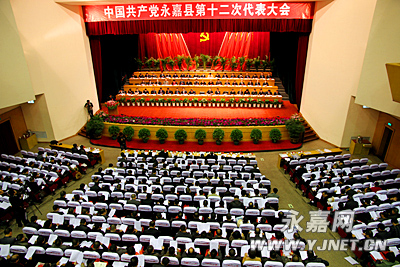 今天的县人民大会堂显得格外庄严和热烈。大会堂主席台正上方悬挂着“中国共产党永嘉县第十二次代表大会”的大幅会标。主席台正中央,鲜艳的红旗簇拥着由镰刀和锤头组成的党徽。二楼眺台上悬挂着“深入实施三大战略,致力打造幸福永嘉”字样的巨型横幅。来自我县各行各业的代表,肩负着全县4万多名党员的重托和全县人民的期望,精神饱满地步入会场。