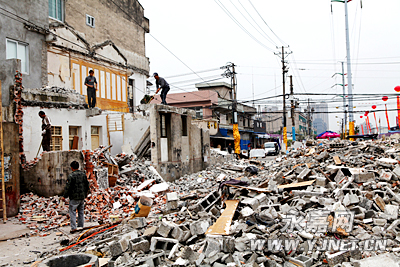 11月15日,在东瓯街道张堡东路北段,五六名拆违工人站在房梁上,抡起大锤猛砸钢筋水泥,盘踞道路中的最后一间楼房终被拆除。至此,这条未打通的道路上7间民房计700平方米的合法建筑和2000平方米的违章建筑全部被拆除,为打通断头路扫除了“拦路虎”。