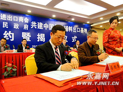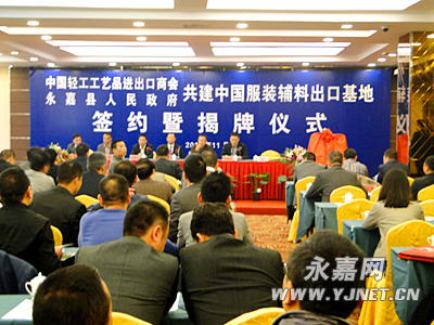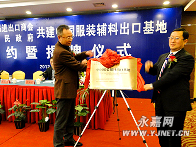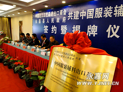 11月20日下午,中国轻工工艺品进出口商会与县政府共建“中国服装辅料出口基地”签约暨揭牌仪式在桥头镇隆重举行,双方将携手共建中国服装辅料出口基地。据悉,这也是全国首个“服装辅料出口基地”。中国轻工工艺品进出口商会副会长张杰,县委副书记、县长娄绍光出席签约并揭牌。县领导郑焕东、傅朝宗及市县有关部门负责人参加仪式。