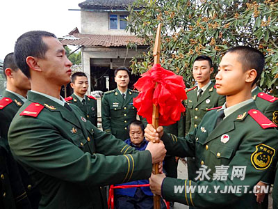 为了铭记“扁担精神”的优良传统,发扬退伍不褪色的精神,20日下午,武警永嘉中队全体官兵到孤寡、残疾老人陈光荣家里进行“扁担交接仪式”。 现年75岁的陈光荣老人自幼残疾,且两岁丧父,一直跟母亲相依为命。1963年,他年迈的母亲在挑水时被一位武警战士发现,了解到他们家的困难后就坚持逢年过节过来慰问,双休日也过来帮忙。老兵们走了,就把照顾陈光荣老人的任务传给新兵。(记者 谷亨飞)