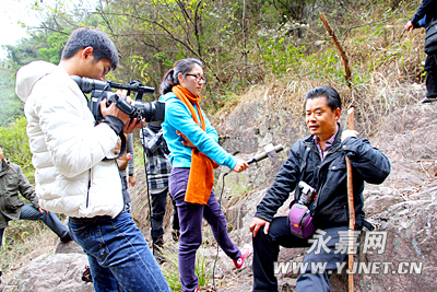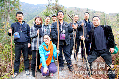 在经过三个小时的攀登,采风团成员终于到达绿嶂山的某一处山峰。成员们忘情歌唱,合影留念,以表达征服山峰的喜悦,感叹永嘉山水之美。