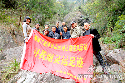 此次攀登的绿嶂山,山路未经开发,多险阻,是谢灵运山水诗之旅目前最难攀登的一次。“裹粮”、“杖策”采风团成员如谢灵运一样做足登山准备,并沿着诗人的足迹寻幽探峰。一路走来,山涧蜿蜒,溪水清澈见底,正如谢灵运诗中描绘的“澹潋结寒姿,团栾润霜质,涧委水屡迷,林迥岩逾密”的情景,令人流连忘返。