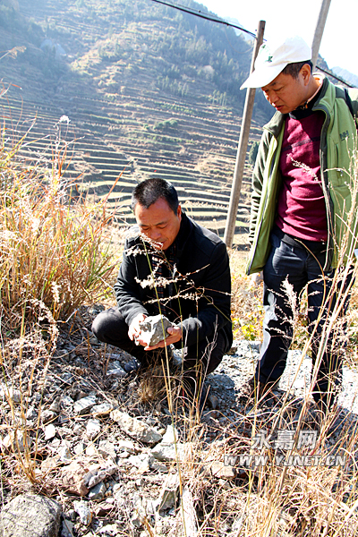 当时的工程管理负责人胡长青带领我们一行寻访金矿,在霞二村与山霞村的途中停了下来,他指着路边的一堆石头说;“对面便是金矿,这里是缆绳运送矿石的地方,这些矿石废弃在这里11年了。”言罢,他敲开几块石头,只见石头断面上有一些闪闪发光的物质。“矿石里含有金、银、锌等,但是含量并不是特别高,需要提炼。”