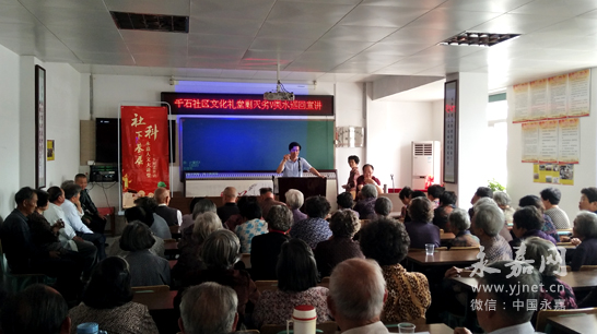 在千石文化礼堂,宣讲团成员杨建南从国内外的环境形势说起,谈到我县存在的环境问题,进而阐述什么是劣V类水,劣V类水的危害以及产生的原因。宣讲员深入浅出地剖析了一个个发生在我们身边的水环境案例,引来大家的阵阵掌声,使他们进一步了解水污染的危害和开展“剿劣”的重要意义。同时,杨建南呼吁大家在生活中要从自己身边力所能及的小事做起,并动员自己的家人都参与到治水护水中来!