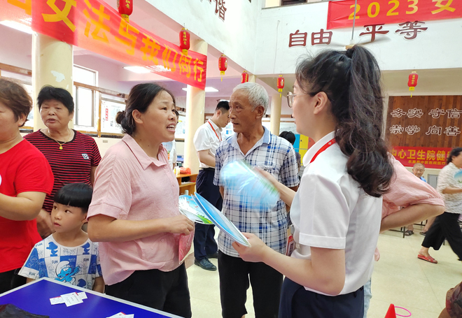 宣讲环节结束后,现场还开展套圈有礼活动。根据游戏规则,每人均有5次套圈机会,套中一个即可得到一条围裙,套中2-3个可得一份红枣绿豆组合装或一包夏枯草,套中3个以上便可得到一份红枣绿豆组合装及一包夏枯草。红枣绿豆粥具有健脾和胃、益气养血功效,夏枯草则有清肝泻火、散结消肿作用。这两样物品虽然价格不高,但在炎炎夏日却也是消暑良方,既与此次活动主题相契合,也由此可见组织者的良好用心,更深得百姓喜欢。套圈有礼活动不仅吸引了老年人参加,就连桥下镇中心卫生院的医生们也都跃跃欲试,积极参与进来。