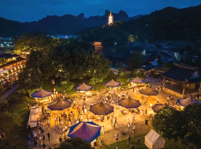 与此同时,岩头镇构建涵盖“夜游、夜赏、夜食、夜娱、夜宿”五位一体的乡村夜景和产业形态。特别是2022年的3.0版本“音乐生活节”重磅来袭,音乐比赛、艺术展览、昆曲实景演出、美食市集等全方位体验类产品精彩纷呈,短短两天吸引旅客2万多人。芙蓉村启动艺术家驻村计划,开发“夜光长塘街”、乡村公益集市、“宋韵楠溪夜”文博会等多个项目,芙蓉古村内的夜明珠广场成为表演宋戏、曲艺、现代乡村剧、钢琴等内容的演艺中心,年均游客量超30万,旅游总收入80万元,让游客在古村之中有了更加丰富新奇的体验,也让千年古村焕发了新生机。