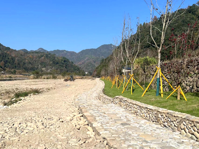 在鹤盛镇蓬溪村,上塆—蓬溪村红枫古道的绿道建设项目也已完工。据介绍,该绿道总长2公里,结合原有地形地貌,进行景观和功能提升。蓬溪村党支部书记表示,这里曾经垃圾遍地,周边环境比较脏乱,在建设绿道以后,不仅环境变美了,村民也多了一个休闲的好去处。“这绿道是从上塆过来到我们蓬溪村,原来是一条老路,旁边环境也很脏乱,周围都是草棚。现在这条绿道修好了,村民们都很高兴,大家有空就会过来散散步,有些人从上塆那边下车直接走过来,也很方便,路上的环境也好,看看山看看水,这个事太好了。”蓬溪村党支部书记谢石吹高兴地说。