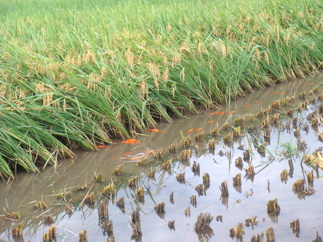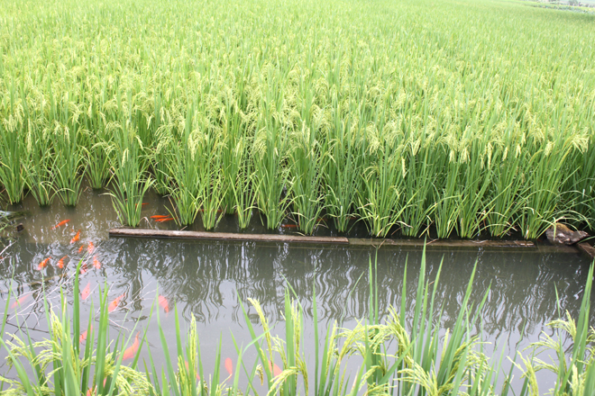 田鱼为主导品种,据浙江大学生命科学学院在全国各地采集的瓯江彩鲤(田鱼)基因测序发现,永嘉采集的瓯江彩鲤基因丰富度最高。稻鱼共生,水稻亩插7000-8000丛,水稻扦插密度低,加上以鱼治虫,可减少农药用量30%-50%,鱼觅食稻花、落谷、杂草、浮萍、水生昆虫及藻类等,鱼粪肥田,可减少肥料用量20%-40%。山区梯田后坎或丘陵平原稻田进水处开挖鱼沟鱼坑,可增加稻田蓄水200多立方。茗岙梯田多种单季晚稻,春耕时分,插秧入田,同时将田鱼苗放养进水田里,与水稻组成了合理的食物链,随着稻子的成长,田鱼汲取稻田中微生物、昆虫、水草、稻花等营养,待稻子成熟,便可以放水捕鱼,这样的共生系统可使稻增产、鱼速长,是立体农业的一种好形式。