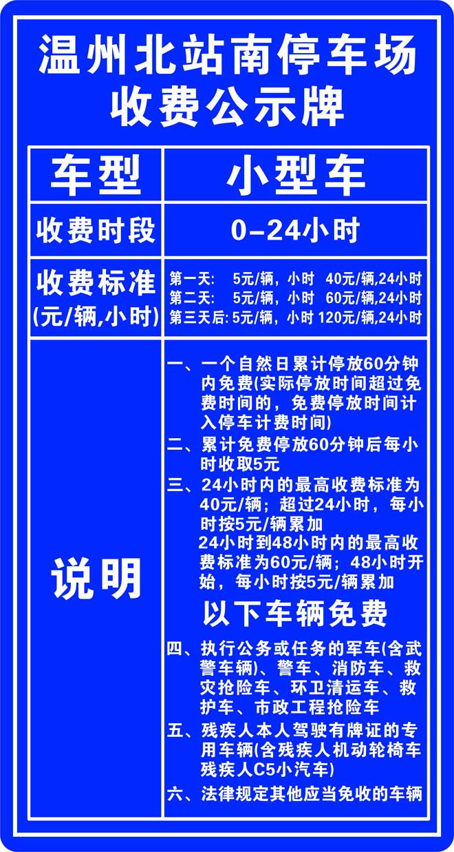 温州北站南停车场共有停车位360个,十月一日起开始收费,一个自然日累计停放60分钟内免费,累计免费停放60分钟后,该部分时间纳入计费时间,按每小时收取5元,24小时内的收费封顶40元,超过24小时,每小时按5元累加,24小时到48小时内的最高收费标准为60元,48小时后开始,每小时按5元累加。