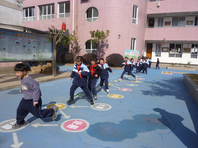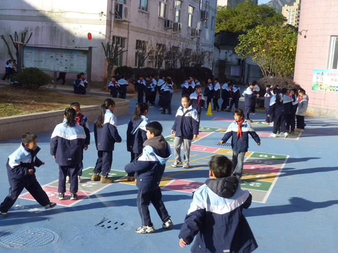 为保证学生每天体育锻炼时间,增强学生的体质,培养学生参与体育活动的兴趣和爱好,乌牛一小还结合开展“阳光体育活动”的需要,因地制宜、巧妙设计,将各种体育活动、游戏以方格、数字等形式表现,并辅以生动形象、色彩亮丽的儿童游戏图案,在内操场地面上彩绘出各种各样的地面游戏图,以丰富同学们的课间活动,地面彩绘游戏也成为乌牛第一小学校园文化的又一道亮丽风景线。