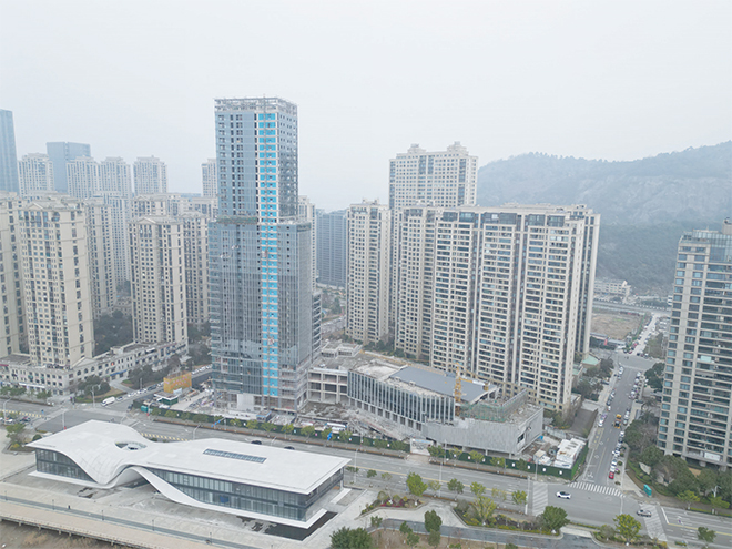 2月25日上午,记者在三江希尔顿酒店施工现场看到,玻璃幕墙如鳞片般逐层攀附而上,多台吊篮悬挂于百米高空,工人正进行玻璃嵌装,室内则同步推进装修作业。据悉,春节过后项目正式进入外立面与内装冲刺阶段,2026年6月将具备开业条件。