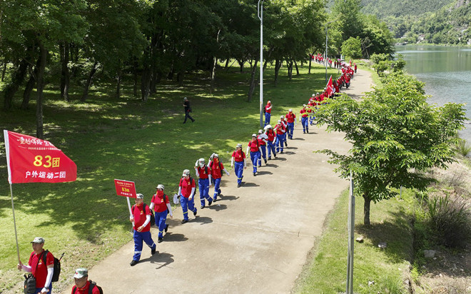 追寻先辈足迹,感悟初心使命。9点10分,由100支团队、2000余人组成的队伍整齐“一字”排列,高举旗帜,正式踏上征程。本次活动全程约12公里,途经高浦渔村、永嘉烈士陵园、渔田村、太平岭、古庙口村等14处,用脚步丈量信仰的高度,以行动诠释初心的力量。一路高歌,奋勇前行。行至渔田村,距出发时间已过1小时,室外最高气温已突破30℃,即使烈日当空,但队员们丝毫没有放弃,他们精神饱满,相互激励,或大喊口号振奋士气,或高唱歌曲汲取力量。《东方红》《没有共产党就没有新中国》《打靶归来》等在绿水青山间回荡。
