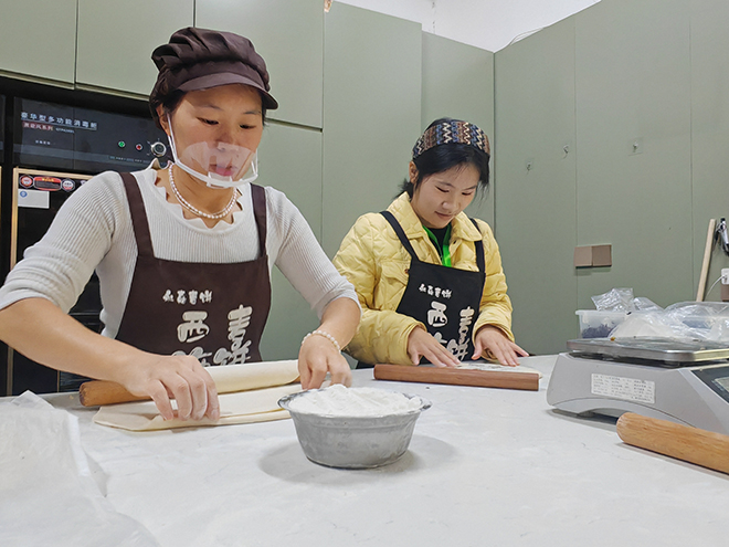 丽水街的西施麦饼店前,来自广州的陆欣怡正跟着工作人员学习麦饼制作。揉面、包馅、擀饼、烘烤,每一个步骤都做得格外认真。当金黄酥脆的麦饼新鲜出炉,被切成小块送到游客手中时,陆欣怡的脸上洋溢着满满的喜悦。"我是在城市长大的,一直很向往乡村生活。"她笑着说,这次亲手制作麦饼的经历让她过足了“手工达人”的瘾。