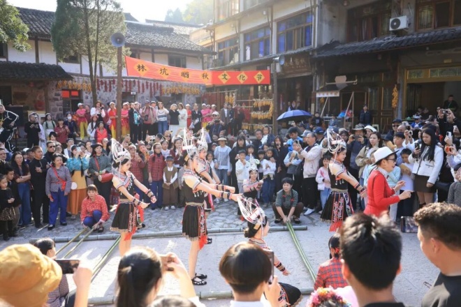 作为连续举办五年的文旅IP,今年的林坑晒秋在保留传统农耕韵味的同时实现三重升级:新增年代感十足的复古供销社、录音机打卡点,让怀旧氛围拉满;农民走秀、宋韵斗鸡、畲族竹竿舞等互动表演轮番上演,打爆米花、制作麦芽糖等非遗体验贴近游客;永嘉麦饼、七彩素面等特色美食汇集,构建起“吃住行游购娱”全要素供给体系。