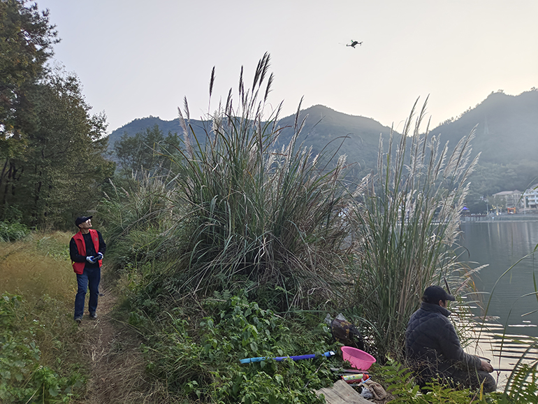 无人机投入巡江,能够通过实时传回的画面精准排查隐患。一旦发现隐蔽处垃圾堆积或违规钓鱼行为,他便立即通知地面志愿者前往处置,既高效完成垃圾清理,又及时开展环保劝导。