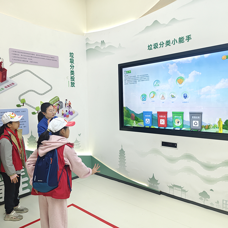 随后,小雷锋们走进生态文明科普展示馆让学生们驻足流连。该展馆是温州地区投资规模最大、科技含量最高的沉浸式互动体验生态文明教育馆,以“无废城市”建设为核心,多个展示区融入多种前沿互动技术。学生们在AR垃圾分类互动区动手实践,在CAVE影院中“亲历”垃圾处置全流程,还通过油墨导电墙、体感游戏等板块,沉浸式感受资源循环的奥秘,“触摸”到生机勃勃的“无废城市”图景。