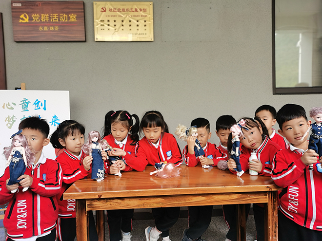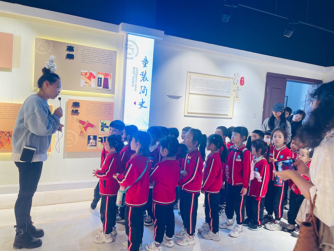 现场,孩子们在讲解员的带领下进入珠岙童装馆。通过丰富的实物展品和历史图片,孩子们了解到从传统汉服、旗袍到现代童装的演变过程。“这件小裙子为什么这么长?”一个小朋友指着民国时期的童装好奇地问。讲解员借此讲述了不同时代儿童服饰的特点及其背后的社会文化变迁。特别引人注目的是珠岙童装村的发展历史展区。从改革开放初期的家庭作坊式生产,到如今形成完整的产业链,珠岙童装村的发展历程让孩子们直观地感受到了家乡产业的蓬勃发展。