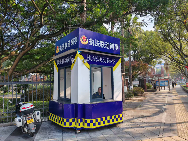 此外,这座执法岗亭不仅是城市管理的“前沿哨点”,更是功能齐全的“便民服务站”。亭内整合了意见反映、咨询引导、简易事务办理、应急求助等多项服务功能,还贴心配备了空调、急救药箱等便民设施,让冰冷的执法场所化身充满“人情味”的服务窗口。同时,岗亭还成为城市管理宣传的重要阵地,执法人员可现场开展政策解读、文明引导等宣传活动,实现“执法、服务、宣传”三位一体有机联动。