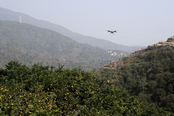 12月8日,岩头镇塆里村塆里农场的瓯柑园里一派繁忙景象——大型农用无人机吊运着满筐瓯柑穿梭山间,这是农场首次运用科技助力采收,也为其打造省级瓯柑精品园添加新保障。
