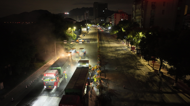 12月9日深夜,在县城望江路上塘殿附近路段,多台铣刨机、摊铺机、压路机等机械设备协同作业,施工人员对原病害路面进行清理,并摊铺新沥青。作业人员脚踩滚烫沥青,实时调整沥青厚度、温度等关键性指标,确保道路更加平整舒适。