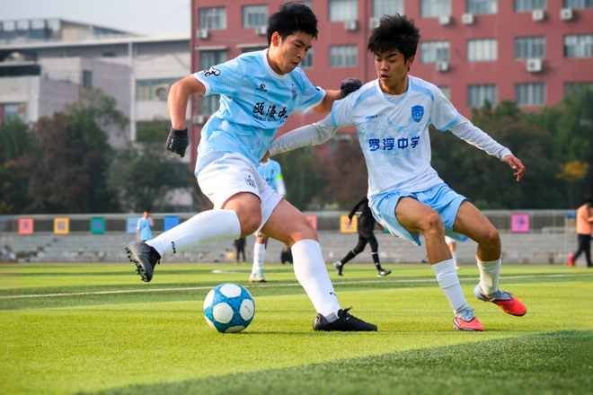 12月11日上午,参赛队之一的罗浮中学校友队与瓯海中学队进行了一场精彩的热身较量。比赛伊始,罗浮中学校友队便展现出强烈的进攻欲望,攻势迅猛,在前十分钟内连续完成三次有威胁的射门,给瓯海中学队的防线带来不小压力。面对对手的猛攻,瓯海中学队防守稳健,队员们协同作战,成功化解了一波波险情,守住了球门。