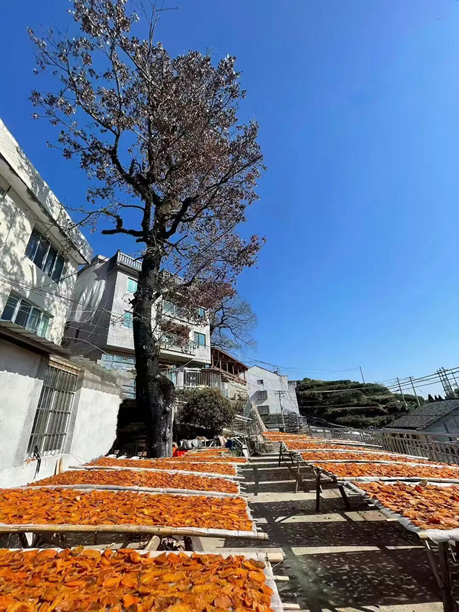 上午九时许,乌牛街道东嶂新村的山坳间早已洒满阳光。房前屋后的晾晒架整齐排布,一排排色泽诱人的番薯枣裹着蜜糖般的光泽,在阳光下格外亮眼。村民们穿梭其间,削皮、切片、翻晒,动作麻利娴熟,欢声笑语漫过山坳。在这座海拔800多米的高山村落里,这枚看似普通的土特产,正描绘着“中国番薯枣之乡”的共富甜蜜故事。
