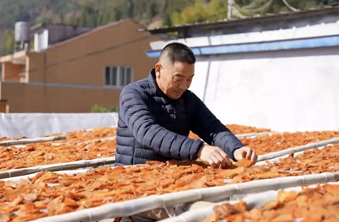 另一边,村民陈小东一家也陷入“甜蜜的忙碌”中。“每年10月挖番薯,先存放一个月让淀粉转化成糖分,等到11月中下旬就开始制作番薯枣。”陈小东一边麻利地翻晒着番薯枣,一边介绍说,父母负责番薯种植和晾晒加工,自己则专攻销售。眼下正是番薯枣销售旺季,订单排得满满当当,“现在外面还欠着一千多斤的订单,得抓紧赶工,还好最近都是好天气,能保证品质。”