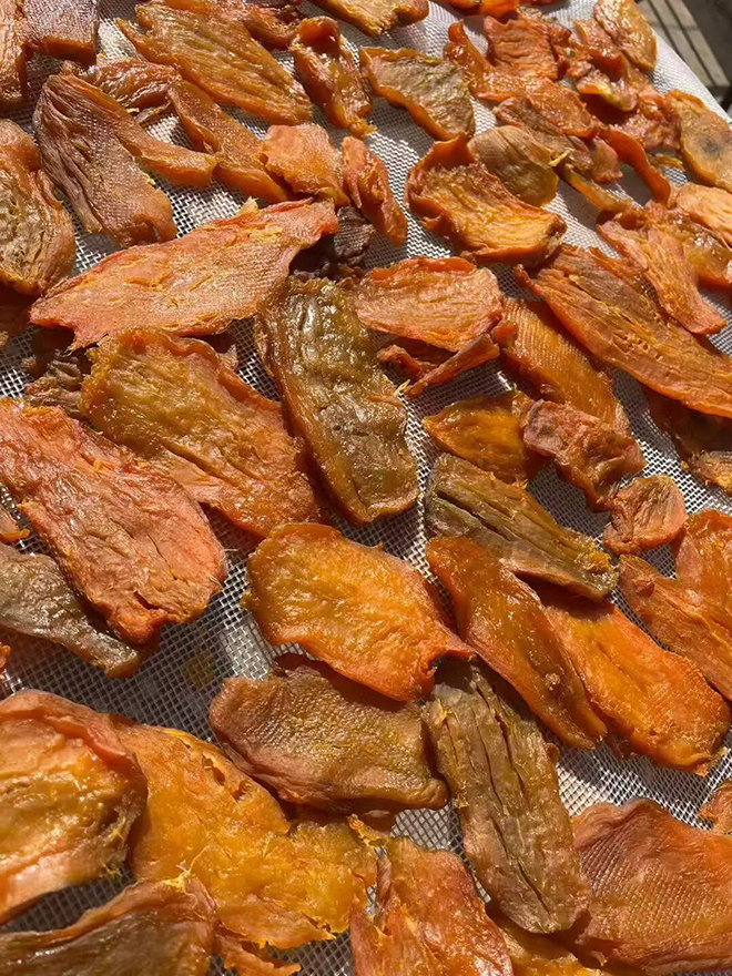 “这个已经晒了三天,像这样的好天气,再晒两天就能成品了。”村民陈珠玉指尖拂过晾晒网上的番薯枣,一边翻动一边笑着介绍,“过去都用竹篱笆晒,容易受潮发霉,还会粘黏果肉;现在换成这种塑料晾晒网,不仅卫生干净,晾晒效率也高多了,晒出来的番薯枣品相也更匀净。”
