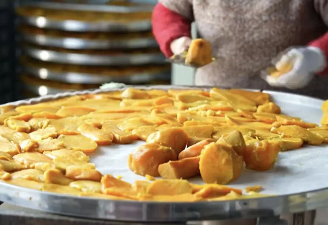 从传统竹篱笆到现代塑料晾晒网,小小的工具升级,背后是东嶂新村番薯枣产业向精细化发展的进阶。不仅如此,蒸制环节的“技术革新”也让村民们省了不少力。“以前用柴火蒸,火大火小不好控制,蒸出来的番薯颜色不均;现在用大容量蒸箱,时间精准把控,蒸出来的番薯又香又糯,颜色还好看。”陈珠玉说着,打开蒸箱展示刚蒸好的番薯,热气腾腾间,香甜味扑面而来,让人垂涎。