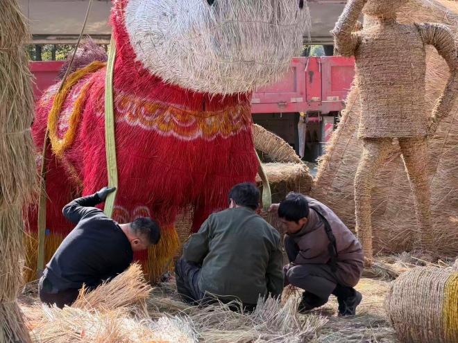 记者探访现场看到,数十名工人师傅正为巨型稻草人精细“美妆”,喷枪喷洒颜料勾勒主体色彩,细毛笔精描眼睛、纹路等细节,龙猫、皮卡丘等动漫形象,神鹿、鲸鱼等创意造型在颜料点缀下愈发鲜活,其中高7米的核心展品“未来·掌控”,耗费上百公斤颜料,以草绳编织银河星球意境,尽显艺术质感。
