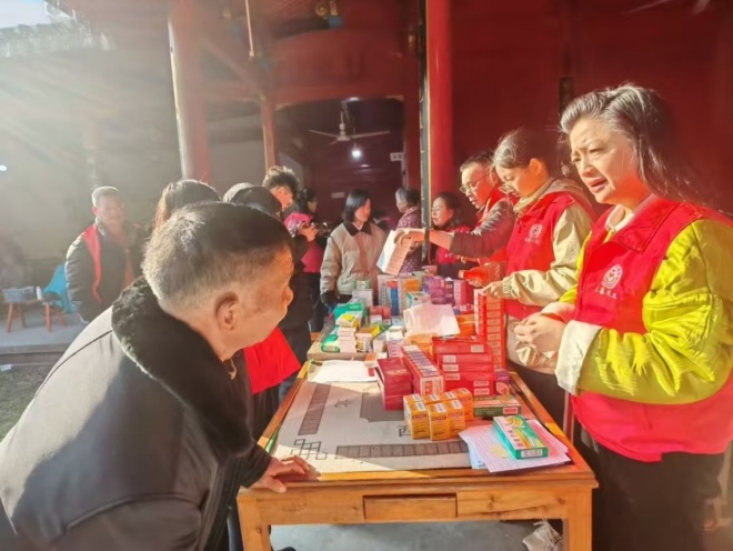 爱心医疗义工队摊位前同样人气十足,志愿者们为有需要的村民免费发放药品。队长戴李芬拥有十五年义诊经验,她深知乡村老年人的健康需求,针对乡村老人常见的肩腰疼痛、高血压等问题,提前准备好止疼药、钙片等药品免费发放,切实缓解村民不适。