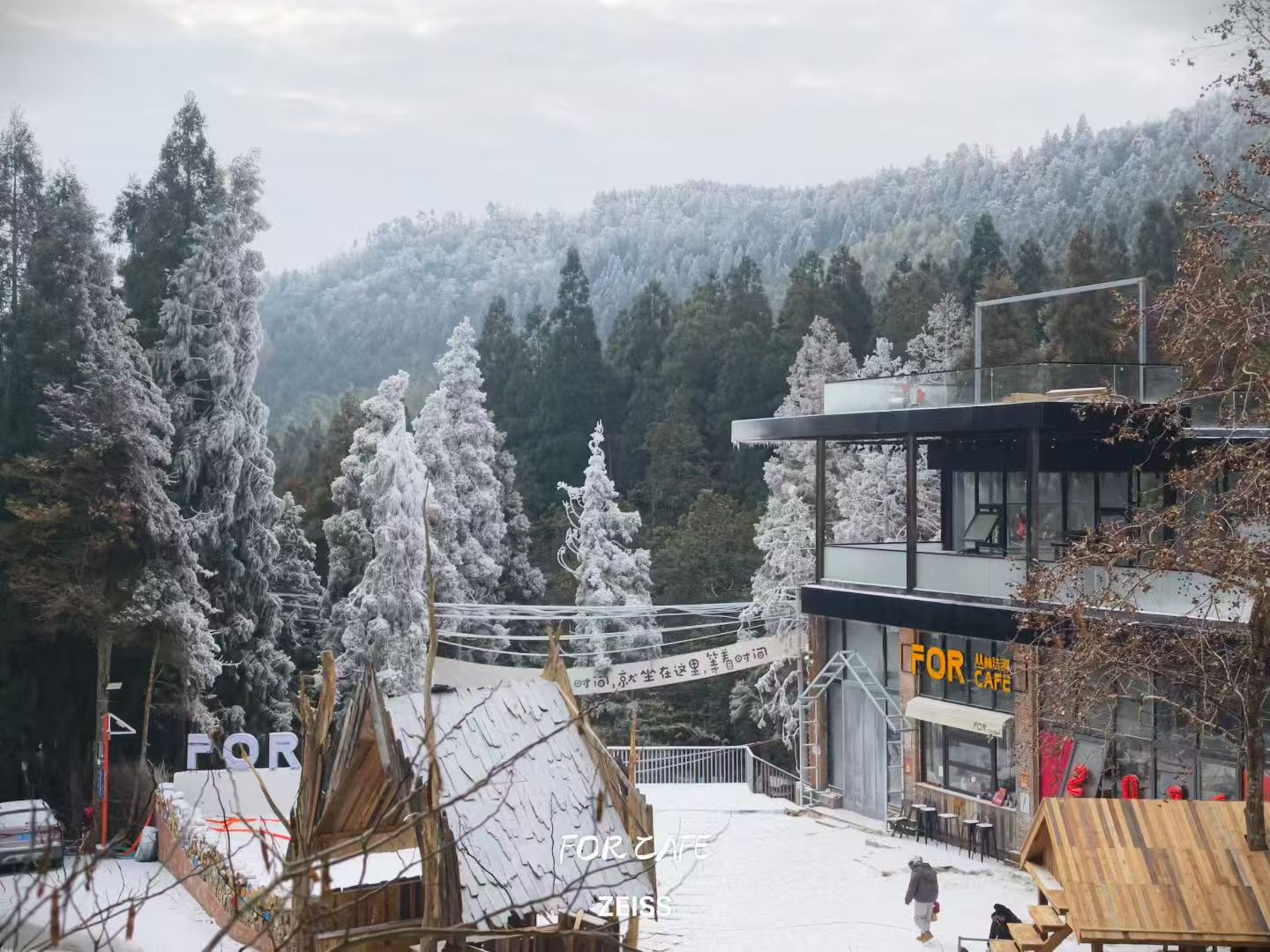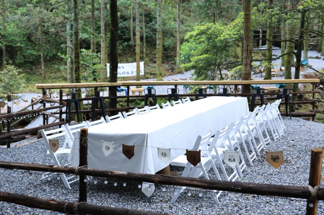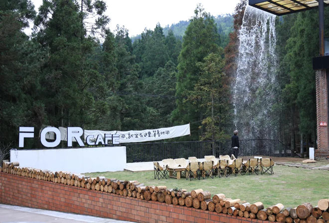 于是,在四海山海拔约800米的转角坡上,一片如童话般美好的万亩原始森林中间,去年5月以来,这里诞生了一座与森林自然共呼吸的咖啡营地——FOR CAFE。据了解,营地共划分为露营区、面包窑、篝火舞台、随便坐区和吧台,慵懒随性的桌椅或沿溪水分布,或穿树林围合,还有沿坡而建的半开放式营帐,是度假休闲、多人团建的“高氧”自由地。这里溪水潺潺,绿意盎然,参天的杉树与松木以近乎神圣的姿态刺破苍穹,树冠层叠交织如翡翠波涛,古老的树皮上满是地衣与苔藓,仿佛下一秒一抬头就能遇见精灵世界。