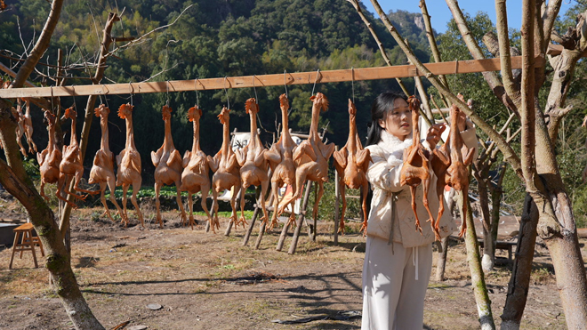 重返村庄的楠溪小六,彻底放下了“速成”的执念,跟着四季的节奏扎根乡村:春挖竹笋、夏摘西瓜、秋晒番薯枣、冬做酱货,用镜头记录下最本真的田园日常。她帮老人把后山的金银花、自家晾晒的笋干菜干一一推广出去,不多的收入,却让村民们攥着现金露出了眼里的光——那是“自己种的东西被认可”的踏实与自豪。
