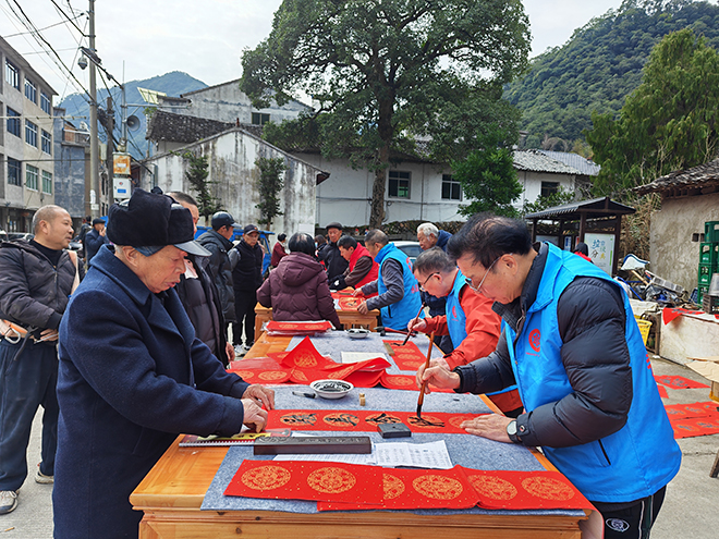 活动当日恰逢立春,麻庄古柏吐露新芽,村民们也忙着迎接家中的新喜事、新变化。义剪、写春联送福字摊位一字排开,吸引了不少老年村民参与。厨师、燃气安全检查志愿者各司其职,全力为村民做好服务。书法志愿者李广刚刚加入义工队参加志愿服务,他开心地说:“老百姓反馈很好。我学书法也有好几年了,写春联时,老百姓围着我要春联,我心里特别开心,也特别有自信。”壶山义工队两名义剪志愿者的摊位旁围满了老年人。年关将至,老人们的理发需求激增,大家都希望在儿孙回家前,整理出崭新面貌。永嘉县燃气行业协会志愿者带着免费的新国标燃气管和安全阀,为叶定泼、章秋兰等村民逐一更换,同时提醒村民检查煤气管道密封性,保持通风,重视燃气使用安全。