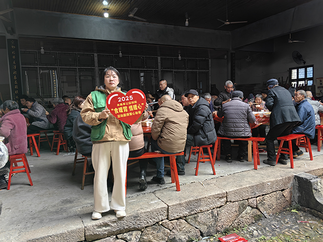 正午时分,后厨进入关键装盘环节。所有志愿者主辅搭配、调油撒料,以流水线式的高效配合,将一道道佳肴从热锅中传送到村民餐桌上。厨师志愿者当日精心调整的食谱中,排骨芋子、清蒸鲈鱼寓意年年有余,家烧鸡块、家烧羊肚、粉丝虾仁滋补暖胃、弹牙适口,红枣桃胶清甜滋补,海参羹汤咸香入味,充分兼顾了老年人的不同口味偏好。麻庄村村民叶乐絮阿婆用餐后,带着一桌老人的好评反馈,喜悦地说:“这个菜味道极好、极鲜,我们这一桌人都很满意。谢谢你们这些义工,还有这位心地善良的厨师。”活动最后,永嘉县燃气行业协会为在场所有70岁以上老年人及低保家庭,送上了5斤年糕,寓意村民家庭年年高升、福气常伴。