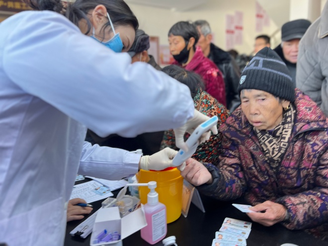 当天上午9时,义诊活动正式启动,现场秩序井然、分工明确。一楼诊疗区设有血压、血糖免费检测服务,医护人员耐心为村民测量指标,详细记录检测结果,并针对指标异常情况现场给出科学的饮食、用药指导;二楼配备便携式B超、心电图设备,让村民足不出村就能完成基础影像学和心血管检查。此次医疗队涵盖骨伤科、心内科、呼吸科等多个专科,医生细致询问村民身体情况,结合诊断情况免费发放所需药品。